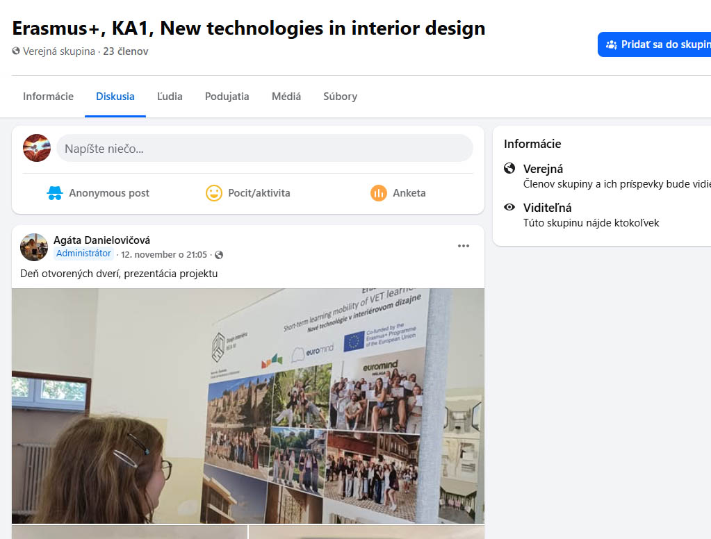 Vytvorenie FB group Erasmus+, KA1, New technologies in interior design